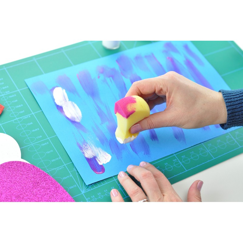 Utilizare: Folosiți buretele pentru a aplica vopseaua prin mișcări ușoare. Experimentați cu culori diferite și combinații creative! Ajută la învățarea despre culori și forme.