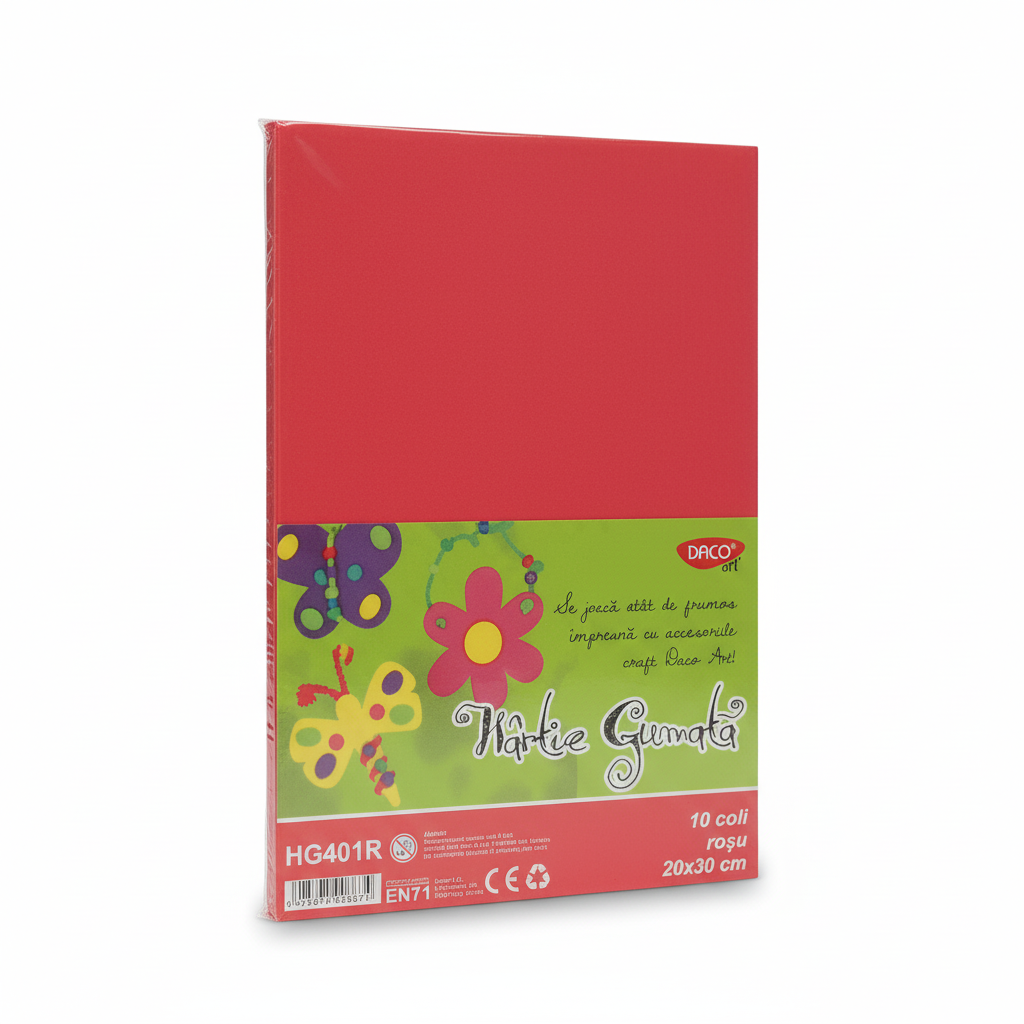 Utilizare: Folosită pentru crearea de obiecte decorative, teme la școală sau activități artistice variate, hârtia gumată stimulează imaginația și abilitățile practice ale copiilor.
