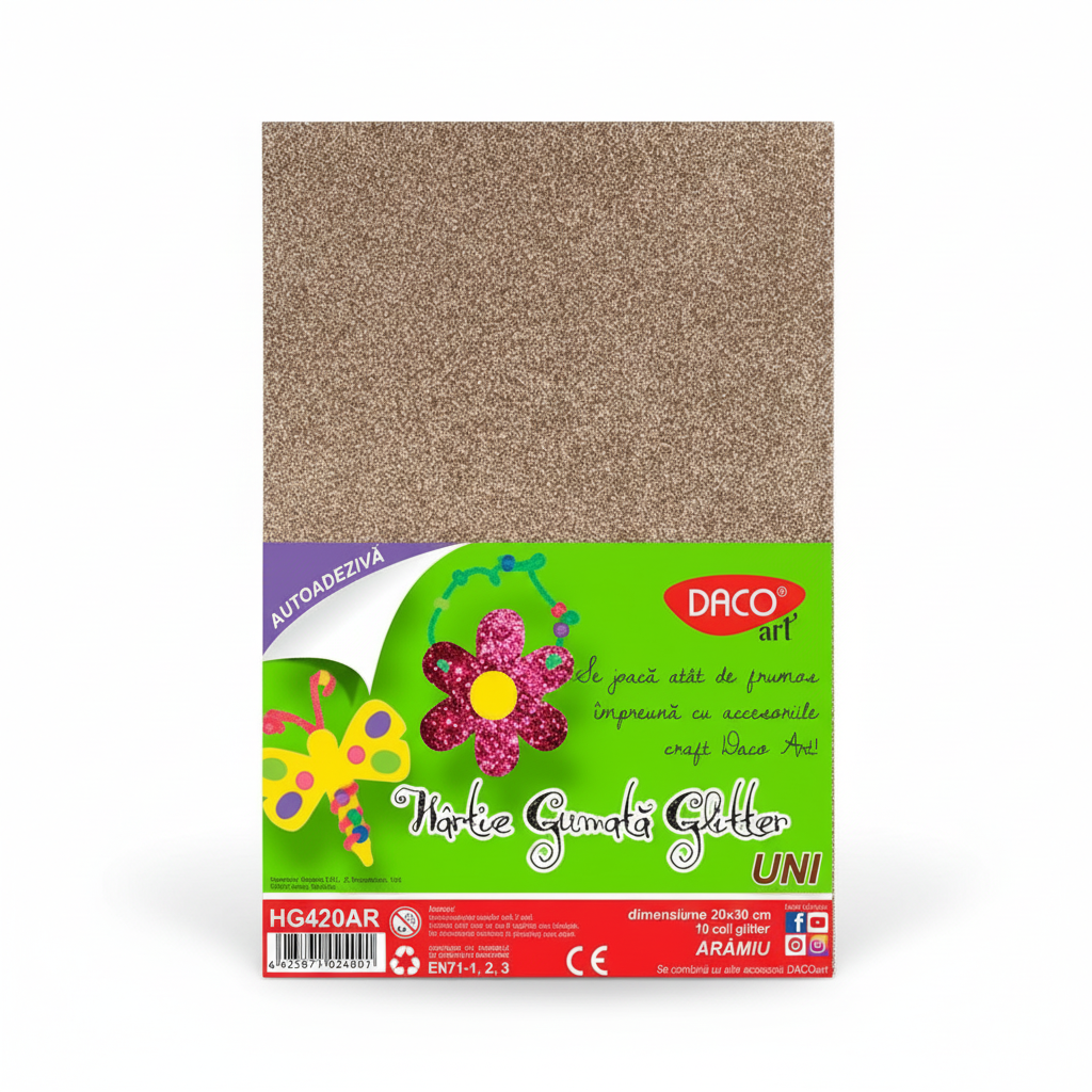 Hârtia gumată autoadezivă glitter aramiu oferă o modalitate distractivă și creativă pentru copii de a-și exprima imaginația. Acest set de 10 coli practic este ideal pentru diferite proiecte de decorare, încurajând dezvoltarea artistică și abilitățile manuale ale celor mici.