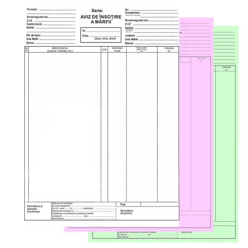 Avizul de insotire a marfii autocopiativ A4, 3 exemplare este un instrument esential pentru gestionarea documentelor in mediul de birou, facilitand procesul de organizare si eficienta in activitatile de transport si livrare.