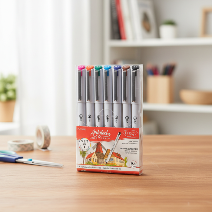 Pixurile Liner DACO sunt instrumente esențiale pentru activitățile de birou, oferind o precizie ridicată în desenul tehnic și grafic. Aceste pixuri sunt disponibile într-un set de 7 culori care pot încuraja creativitatea în proiectele tale.