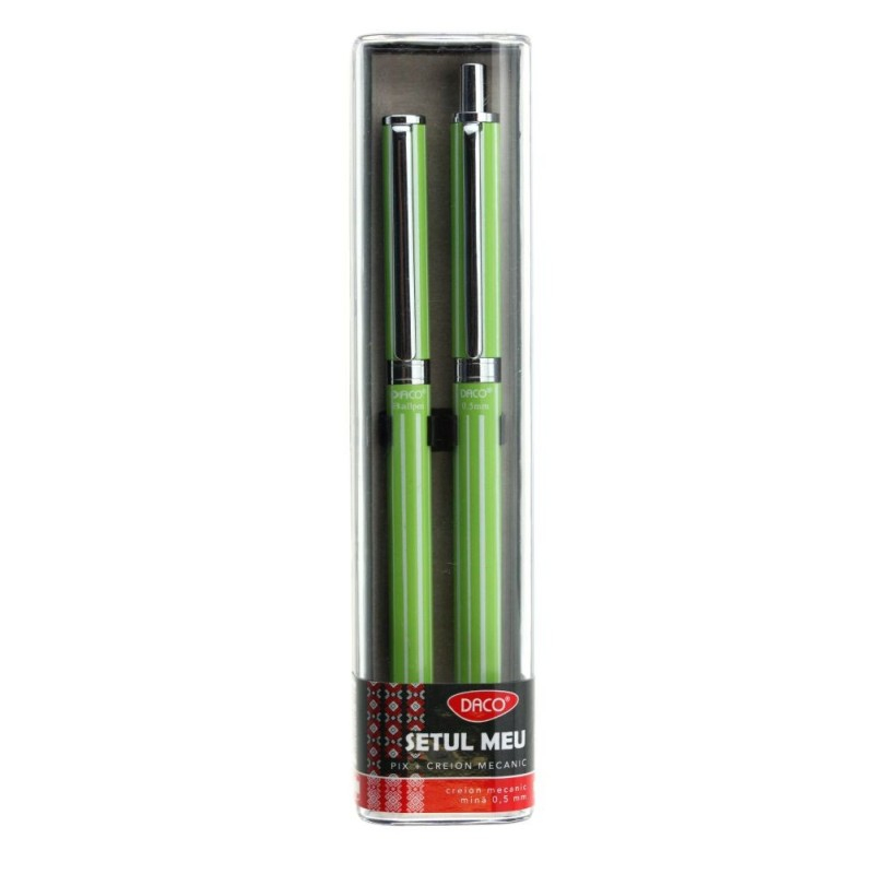 Setul Daco SE404V este soluția ideală pentru utilizare zilnică, permițând un scris fluid și eficient. Cu un design elegant, acest set include un pix cu mecanism de acționare prin răsucire și un creion mecanic de 0.5 mm, ideal pentru notițe rapide și organizare. Materialul metalic asigură durabilitate, iar ornamentele argintii conferă un aspect rafinat.