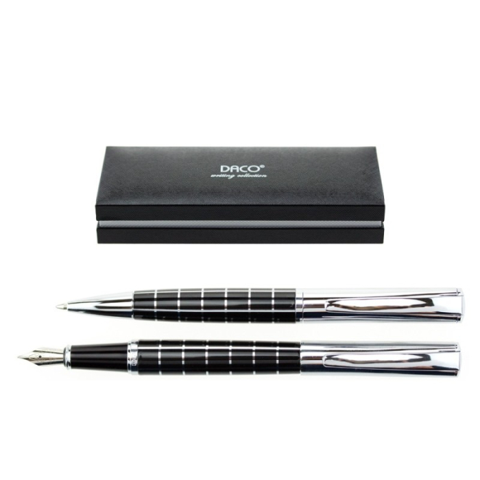 Setul Daco SE275, compus dintr-un pix și un stilou, este soluția perfectă pentru cei care își doresc un instrument de scris elegant și eficient. Acest set de scris se remarcă prin designul său modern și sofisticat, într-o carcasă metalică neagră cu detalii argintii, ideal pentru birou sau pentru uz personal.