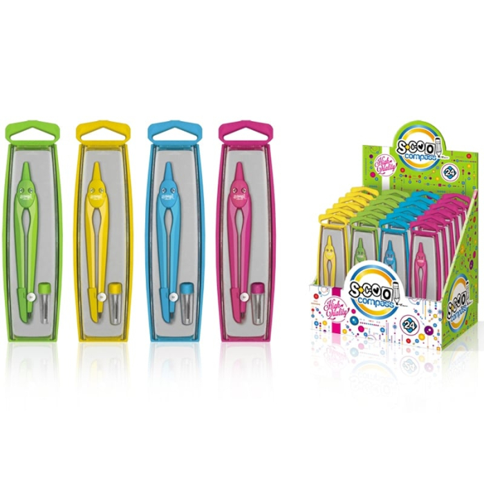 Compasul neon + rezerva mina - S-COOL este un instrument indispensabil pentru realizarea desenelor geometrice precise. Acesta aduce un plus de culoare și eficiență în lucrările elevilor, fiind esențial pentru teme și examene.