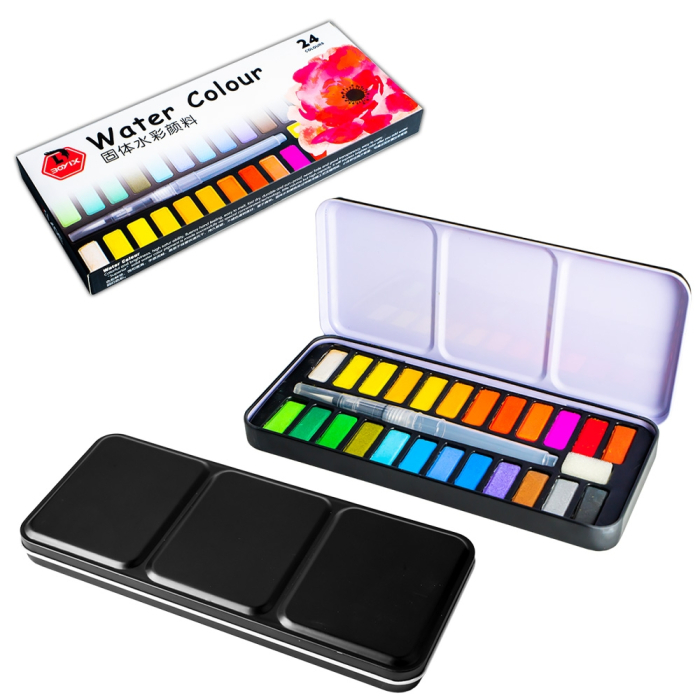 Acuarele 24 culori sunt un set perfect pentru micii artiști care doresc să își exprime creativitatea. Aceste acuarele sunt ideale pentru teme, proiecte școlare și momente pline de distracție. Setul include 24 de pastile de culoare, o pensulă cu rezervor pentru apă și un burete, totul depozitat într-o cutie metalică practică.