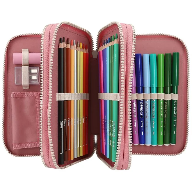 Penarul triplu conține creioane, markere, radieră și foarfecă, toate esențiale pentru școală.