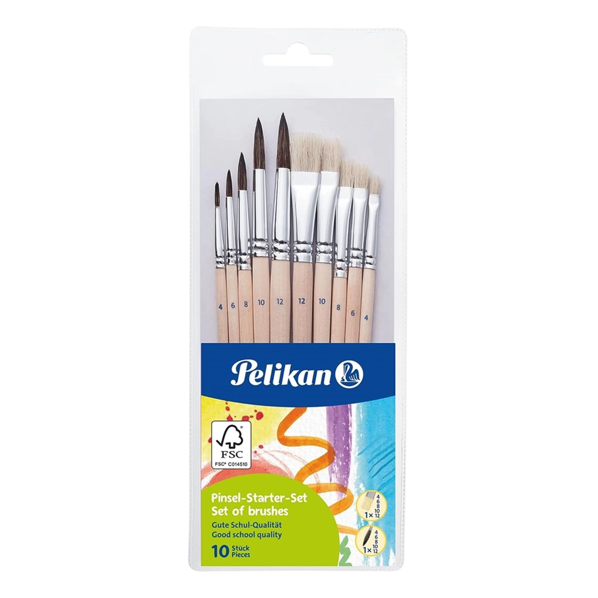 Setul de pensule pentru incepatori Pelikan este alegerea potrivită pentru orice mic artist sau student. Acest pachet conține 10 pensule, 5 cu varf rotund pentru detalii fine și 5 cu varf lat, ideale pentru acoperirea suprafețelor mari și pentru realizarea peisajelor.