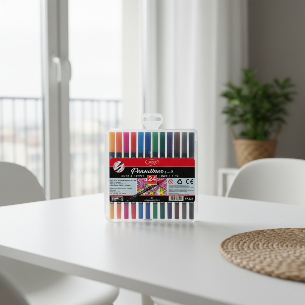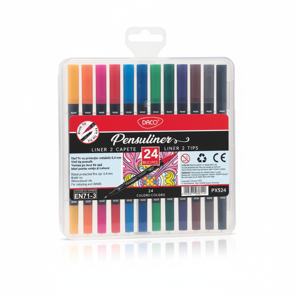 Pix DACO Pensuliner Set 24 este un set esențial pentru birou, optimizat pentru a maximiza productivitatea. Acesta cuprinde 24 de culori vibrante și oferă un sistem de utilizare dual, permite o scriere precisă și creativă, fiind ideal pentru diverse activități de birou.