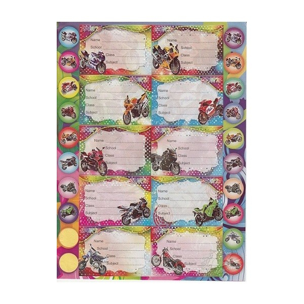 Etichetele autoadezive scolare cu model MOTOCICLETE sunt ideale pentru a ajuta elevii să se organizeze mai bine. Aceste etichete au dimensiunea de 72mm x 47mm și includ câmpuri pentru Nume, Școală, Clasă și Materie, făcându-le utile pentru orice temă sau examen.
