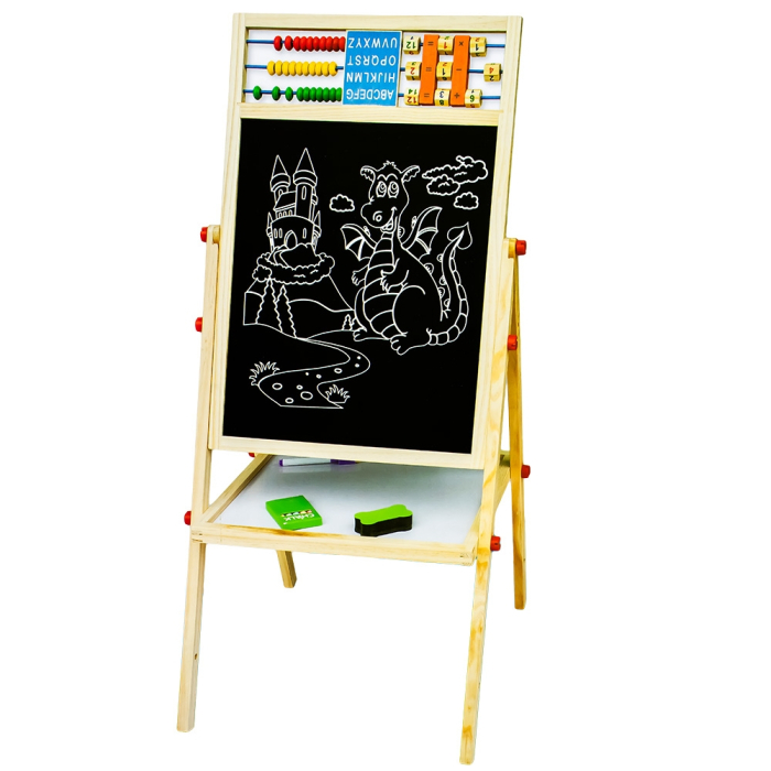 - Tabla are 2 fete, una alba, magnetica si cealalta neagra, plus abac, ceas, panou pentru calcule matematice si tavita-suport.