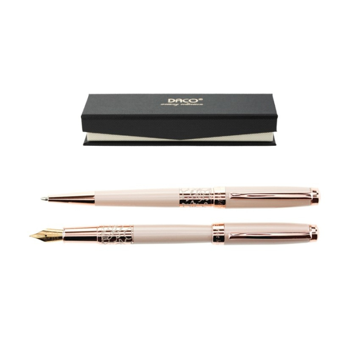 Setul de pix și stilou Roz Daco SE268RZ este soluția ideală pentru un birou organizat și productiv. Cu un design elegant, corp metalic roz și ornamente aurii, acest set nu doar că arată bine, dar și îmbunătățește experiența de scriere. Pixul cu mină tip Parker și stiloul cu patron de cerneală standard asigură un scris fluid și precis, reducând timpul petrecut pe documente.